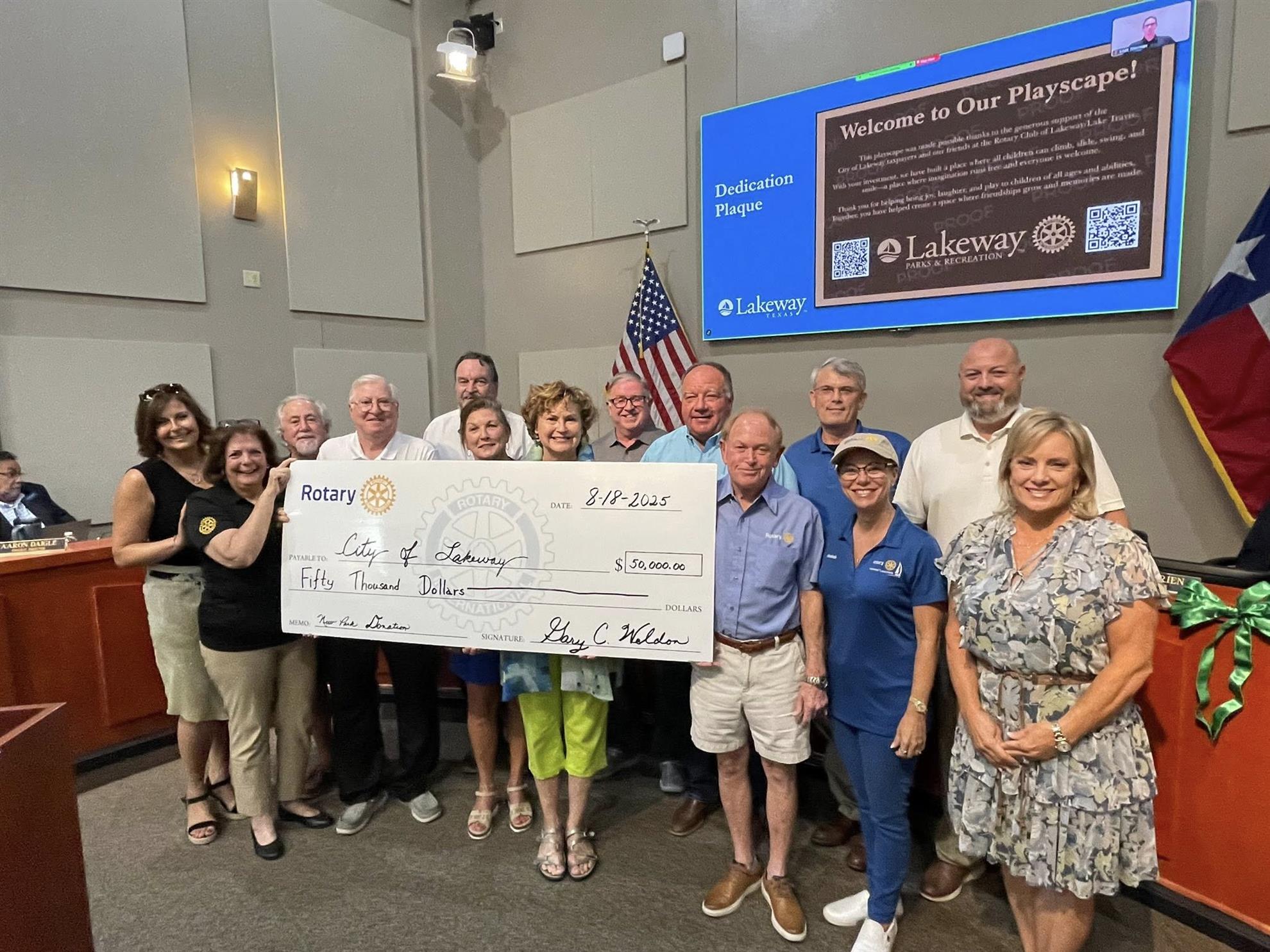 Lakeway/Lake Travis Rotary Club Donates $50,000 for Inclusive Playscape![]() The Rotary Club of Lakeway/Lake Travis has made a lasting impact on their community by donating $50,000 toward the new Lakeway Activity Center Playscape Project. Supported by the May 2024 Parks Improvement Bond, this innovative playscape has been designated as a PLAYCORE National Demonstration Site for meeting the highest standards of inclusive design, nature integration, and active play.