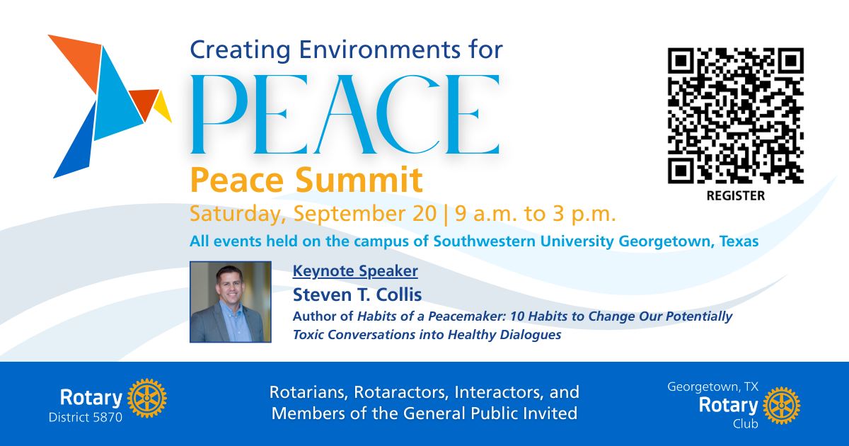 Creating Environments of Peace: A Peace Summit on September 20th![]() Join fellow changemakers for a day of learning, connection, and inspiration at the Creating Environments of Peace Summit, hosted by Rotary District 5870 and the Rotary Club of Georgetown, Texas.