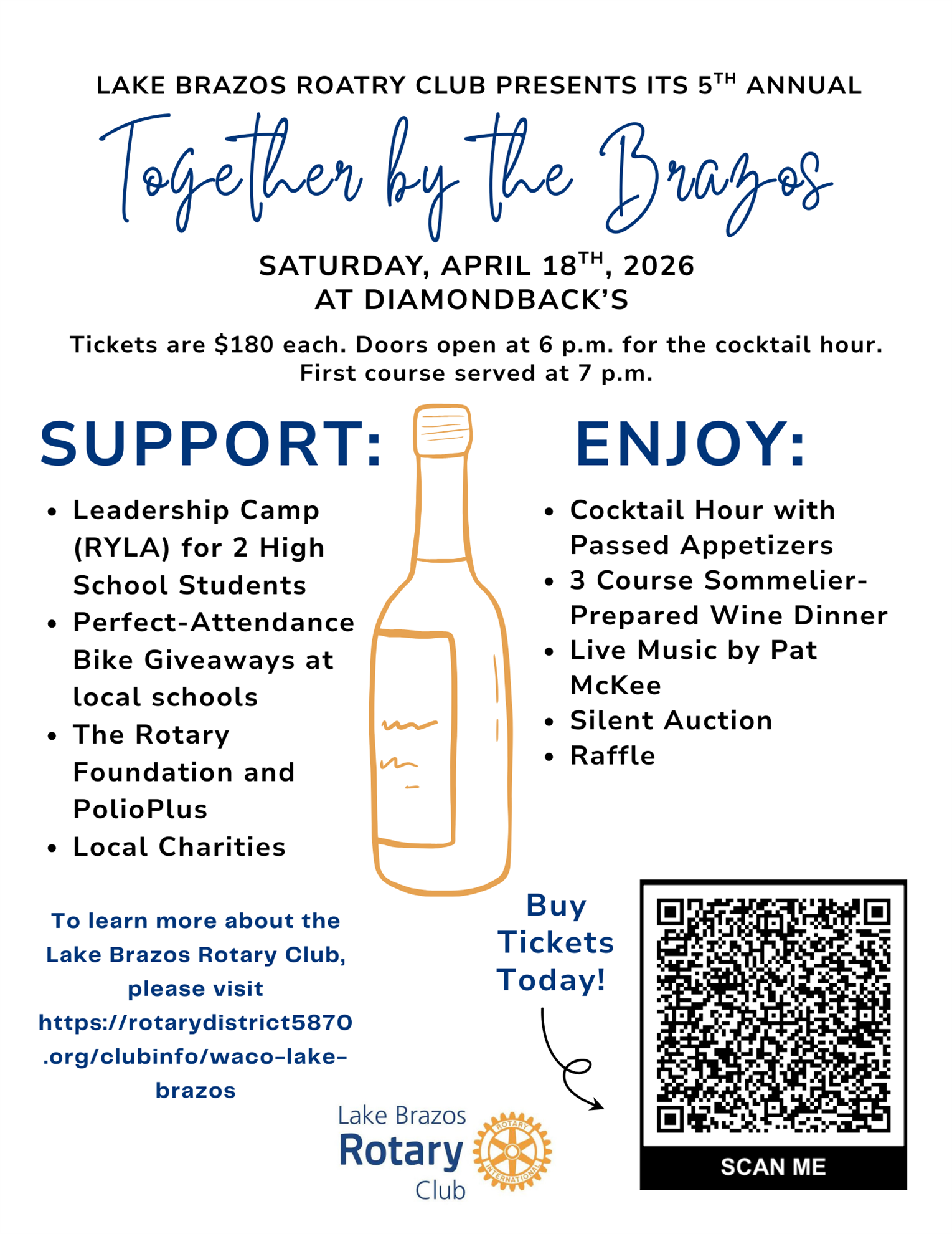Lake Brazos Rotary Announces its 5th Annual "Together by the Brazos" Fundraiser![]() The Lake Brazos Rotary Club is excited to announce its 5th Annual "Together by the Brazos" fundraising event, a premier evening of fine dining and community support scheduled for Saturday, April 18, 2026, at Diamondback's in Waco, Texas. Doors open at 6 p.m. for a cocktail hour featuring appetizers, with the first course of a sommelier-prepared three-course wine dinner served at 7 p.m. Tickets are priced at $180 each, offering guests an elegant experience that includes live music by Pat McKee, a silent auction, and a raffle. |