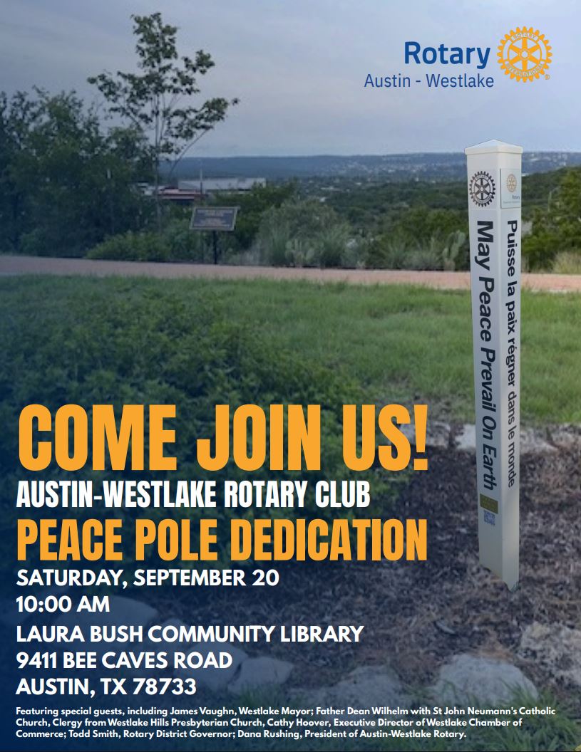 Rotary Peace Pole DedicationEveryone is invited to join us at 10 AM on September 20 as we dedicate our Austin-Westlake Rotary Peace Pole on the grounds of Laura Bush Community Library at 9411 Bee Caves Road, Austin 78733. Speakers include Dana Rushing, President of Austin-Westlake Rotary Club; Todd Smith, Rotary District Governor; James Vaughan, Westlake Mayor, Clergy from local churches, and Cathy Hoover, Exec.Director, Westlake Chamber of Commerce. May Peace Prevail on Earth.