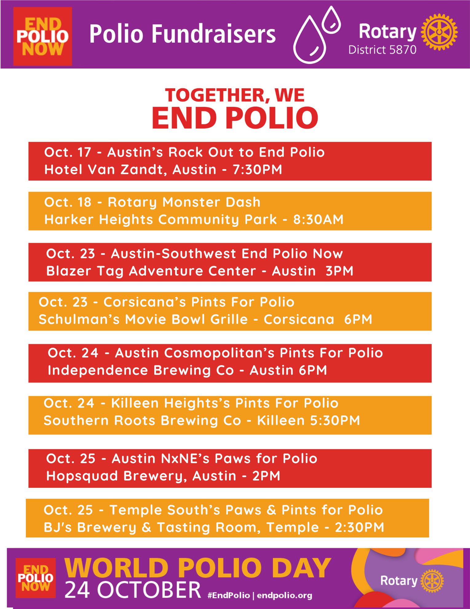 Join a Polio Fundraiser This October![]() October is here, and with it comes World Polio Day on October 24th—a time for Rotarians and friends to celebrate the incredible progress in the fight to end polio and to continue raising awareness and funds for this important cause.