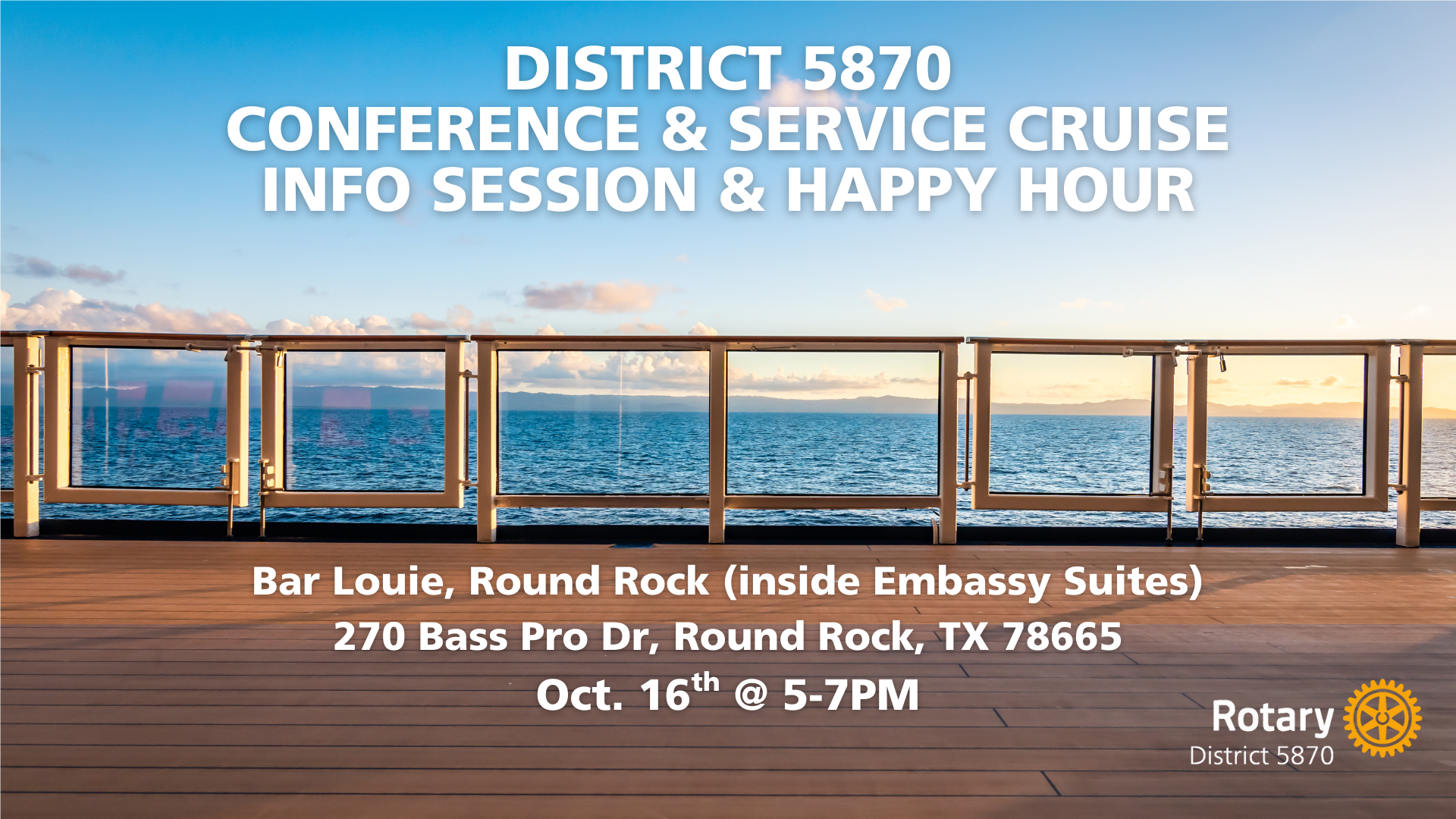 District Conference & Service Cruise Info Session + Happy Hour![]() Join us for an exciting evening of connection, conversation, and cruise inspiration, hosted by our partners in travel - International Cruise Control, Inc. on Oct. 16th! Must RSVP. Whether you're already booked or just curious about the upcoming District Conference & Service Cruise, this is your chance to: |