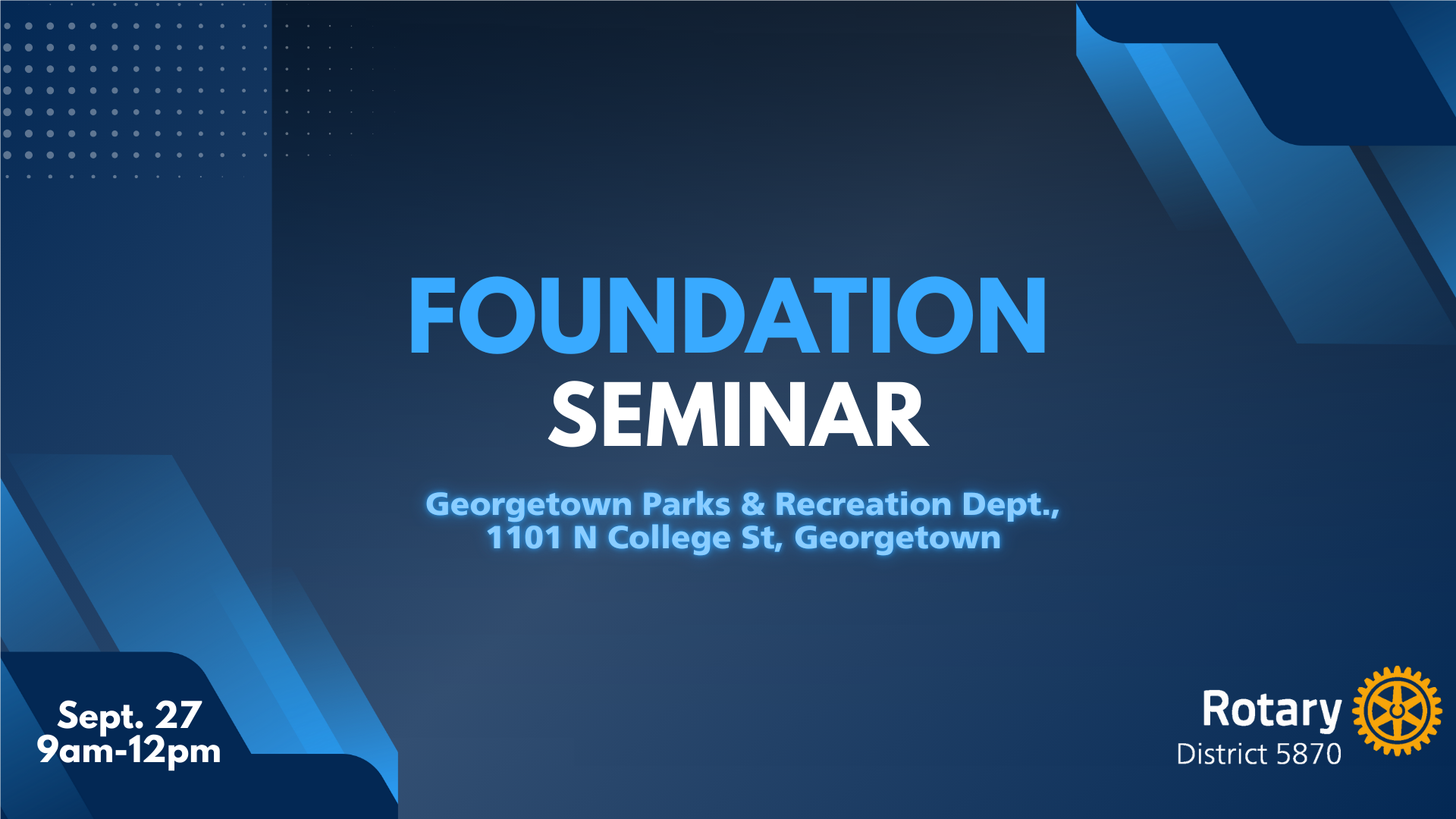 Register for the Foundation Seminar - Sept. 27th![]() Join us on Saturday, Sept. 27th at 9AM for the FOUNDATION SEMINAR at the Georgetown Parks & Recreation Dept. 1101 N College St, Georgetown (Hybrid - in person/zoom). Open to all Rotarians! Whether you are a new club Foundation Chair, have years of experience, or simply interested in understanding how our Rotary Foundation operates, there's something for everyone. Click to Register