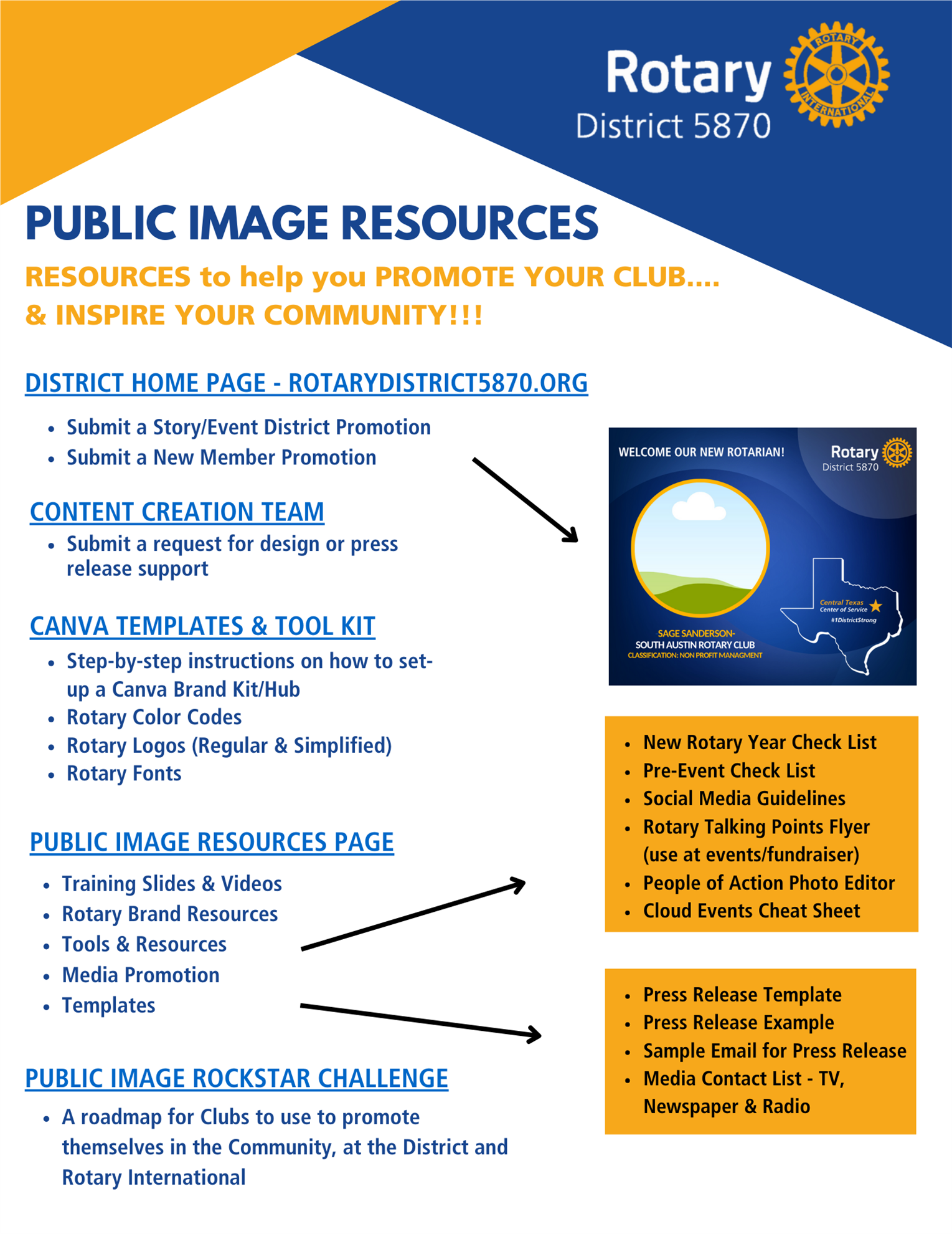 Shine a Spotlight on Your Club with Public Image Resources![]() Strong public image helps Rotary Clubs tell their story, attract new members, and highlight the incredible service projects making a difference in our communities. To make this easier, your District Public Image team has developed a collection of ready-to-use resources designed to save you time and boost your club’s visibility. Here’s what’s available: