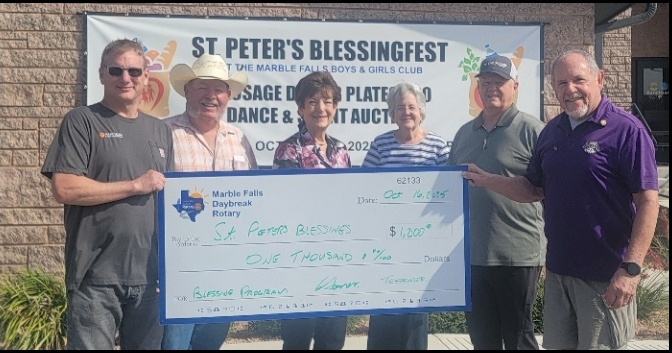 Marble Falls Daybreak Rotary Supports Peter’s BlessingsThe Marble Falls Daybreak Rotary Club continues to make a meaningful difference in the community with a recent $1,000 donation to Peter’s Blessings, a local nonprofit dedicated to providing food and essential resources to families in need.