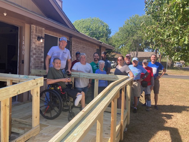 Northwest Waco Rotary Club recently worked with Habitat for Humanity to build a wheelchair ramp at a Waco home. Pictured on the front row, left to right, are Habitat staff member Angie Moore, Fawn Robinson, Greg Evans, Habitat staff member Robyn Trippe, and Kim Patterson. Back row, left to right: Bryan Fonville, James Jackson, Del Follis, Caleb Follis, Mike Hall, Tom Yows, Steve Smith and Ken Luikart.