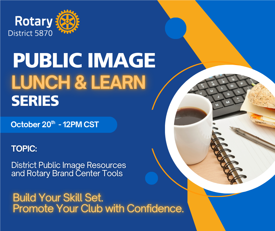 Join us at the Public Image Lunch & Learn![]() You are invited to our upcoming Public Image Lunch & Learn Series, on Monday, October 20th at 12PM. Topic: District Public Image Resources and Rotary Brand Center Tools. This is a great opportunity to sharpen your skills and gain practical tools to help promote your club with confidence.