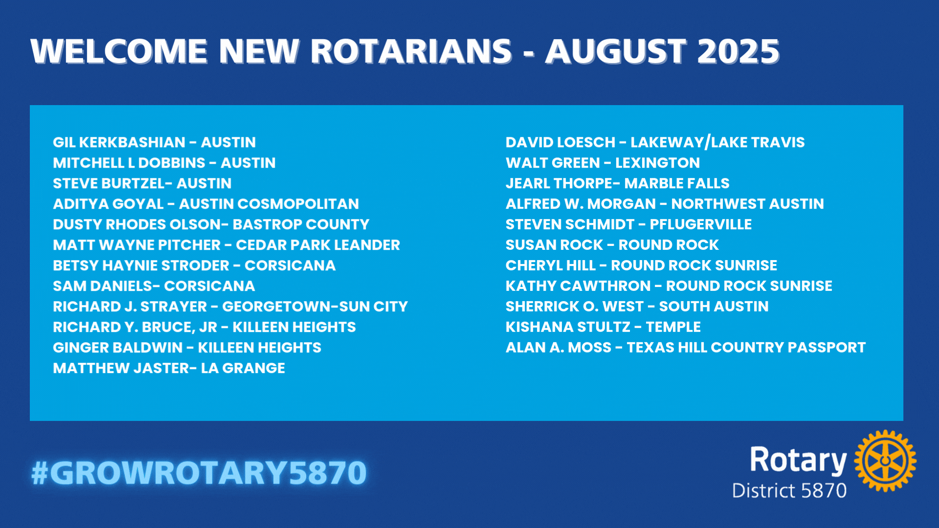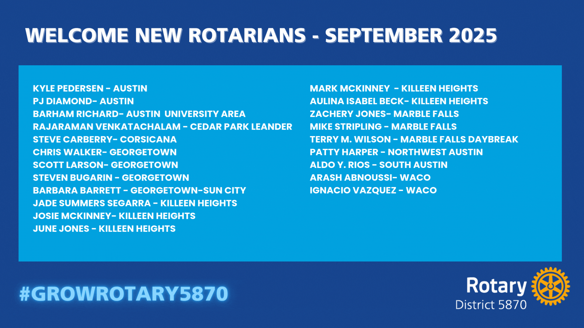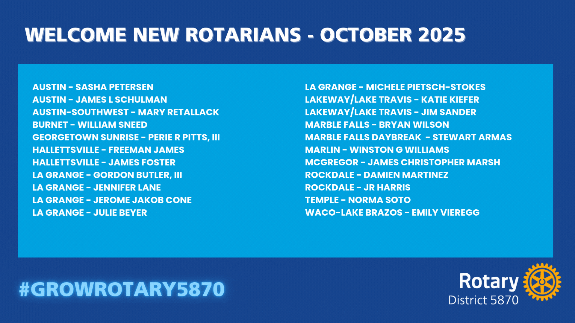 The Rotary Foundation in Action: District 5870’s Year of ImpactDistrict 5870 Central Texas has proven once again that we are People of Action, a network of servant leaders united by generosity, service, and vision. Under the leadership of District Governor Doug Smith, our clubs came together with focus and passion, fueling a year of record-breaking momentum and the results speak for themselves. |
