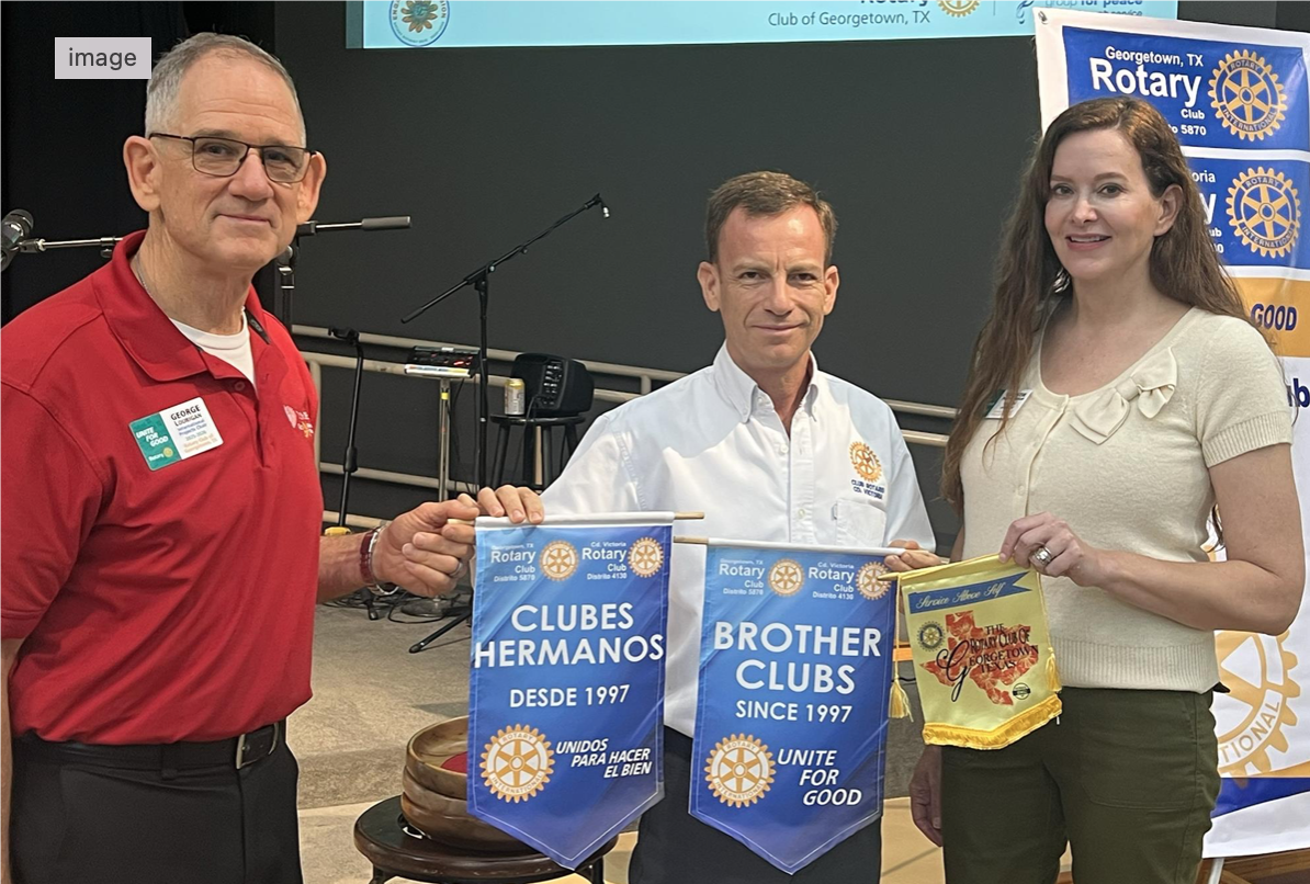 Visit from our Brother Club!![]() Member George Lourigan and President Christie Parker-Wheeler of the Georgetown Club pose with Magid Velez, President of the Rotary Club of Ciudad Victoria, Mexico. President Magid made presentations to include a book on his Club's history, Mexican candy, and a bottle of mezcal!