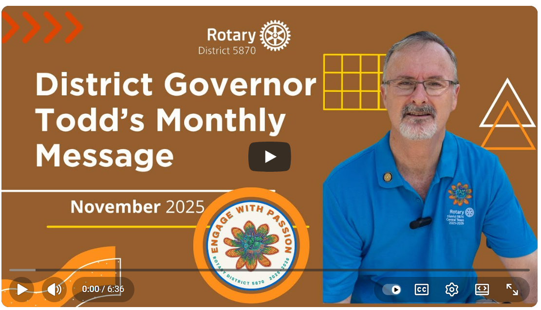 District Governor Todd Smith's September Message![]() August Momentum and a Look Ahead – A Worthy Message - From heartfelt club visits to $6-figure results in Texas flood relief efforts, August was a month of extraordinary impact across District 5870. Membership is growing, generosity is flowing, and the spirit of Rotary is alive in every handshake, service project, and new member induction. |