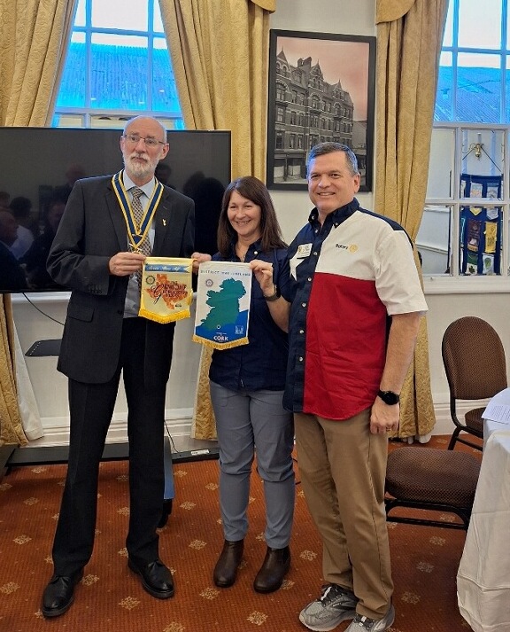 From Georgetown to Cork!Georgetown members Michele and Joe Cuteri impressed the 99-year old Rotary Club of Cork, Ireland by wearing their Rotary name badges and gifting District 5870 pins during the banner exchange.