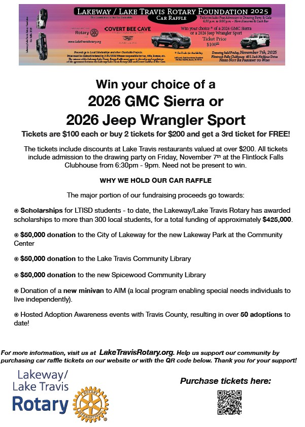 Lakeway/Lake Travis Rotary Club Launches Annual Car Raffle to Support Local Projects![]() The Lakeway/Lake Travis Rotary Club has officially kicked off ticket sales for its highly anticipated Annual Car Raffle, a community-favorite fundraiser that helps drive meaningful change right here at home. |