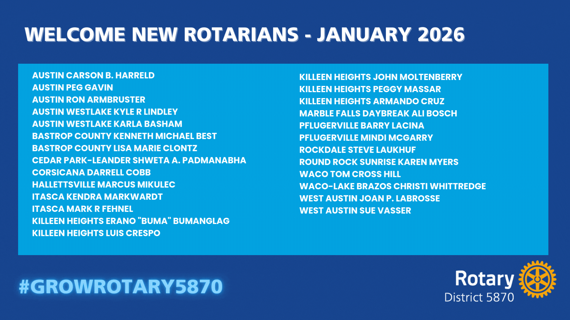 Registration Now Open! Join Us for the 2026 Foundation Gala![]() You’re invited to the Hearts of Gold District 5870 Central Texas Foundation Gala on February 7, 2026, hosted at the beautiful Embassy Suites Hotel by Hilton! Join Rotarians from across the district for a special night dedicated to celebrating service, generosity, and the incredible impact of the Rotary Foundation. |