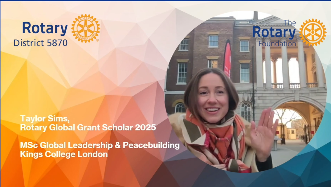 Global Grant Scholar Spotlight: Taylor Sims![]() Taylor Sims, a District 5879 2025-26 Rotary Global Grant Scholar, is pursuing an MSc in Global Leadership & Peacebuilding at King’s College London, focusing on peacebuilding, dialogue, and practical approaches to long-term stability in an increasingly complex world.