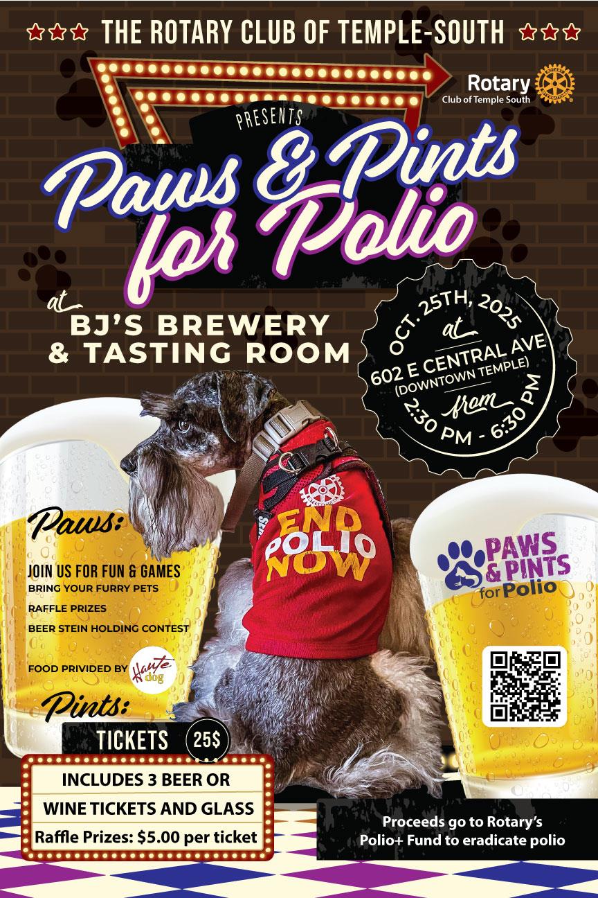 Temple South's Paws and Pints for Polio - Oct. 25th![]() The Rotary Club of Temple South invites you to join them at their PAWS AND PINTS FOR POLIO EVENT on Saturday, Oct. 25th at BJ's Brewery and Tasting Room. Click to buy your tickets in advance.